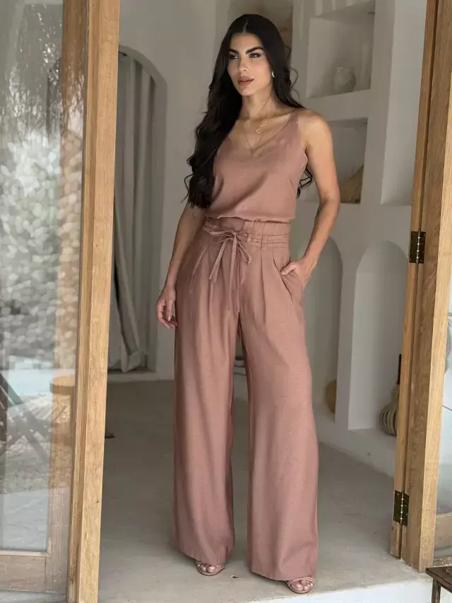 Observação: Por se tratar de um tecido natural (linho ou viscose), a peça pode apresentar leve encolhimento no comprimento após a primeira lavagem.