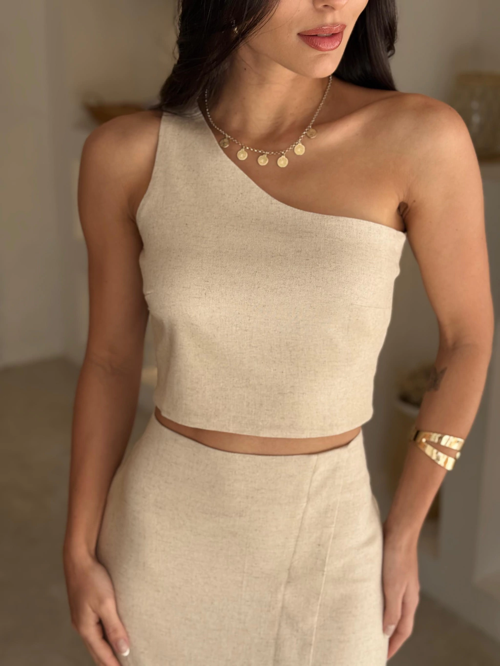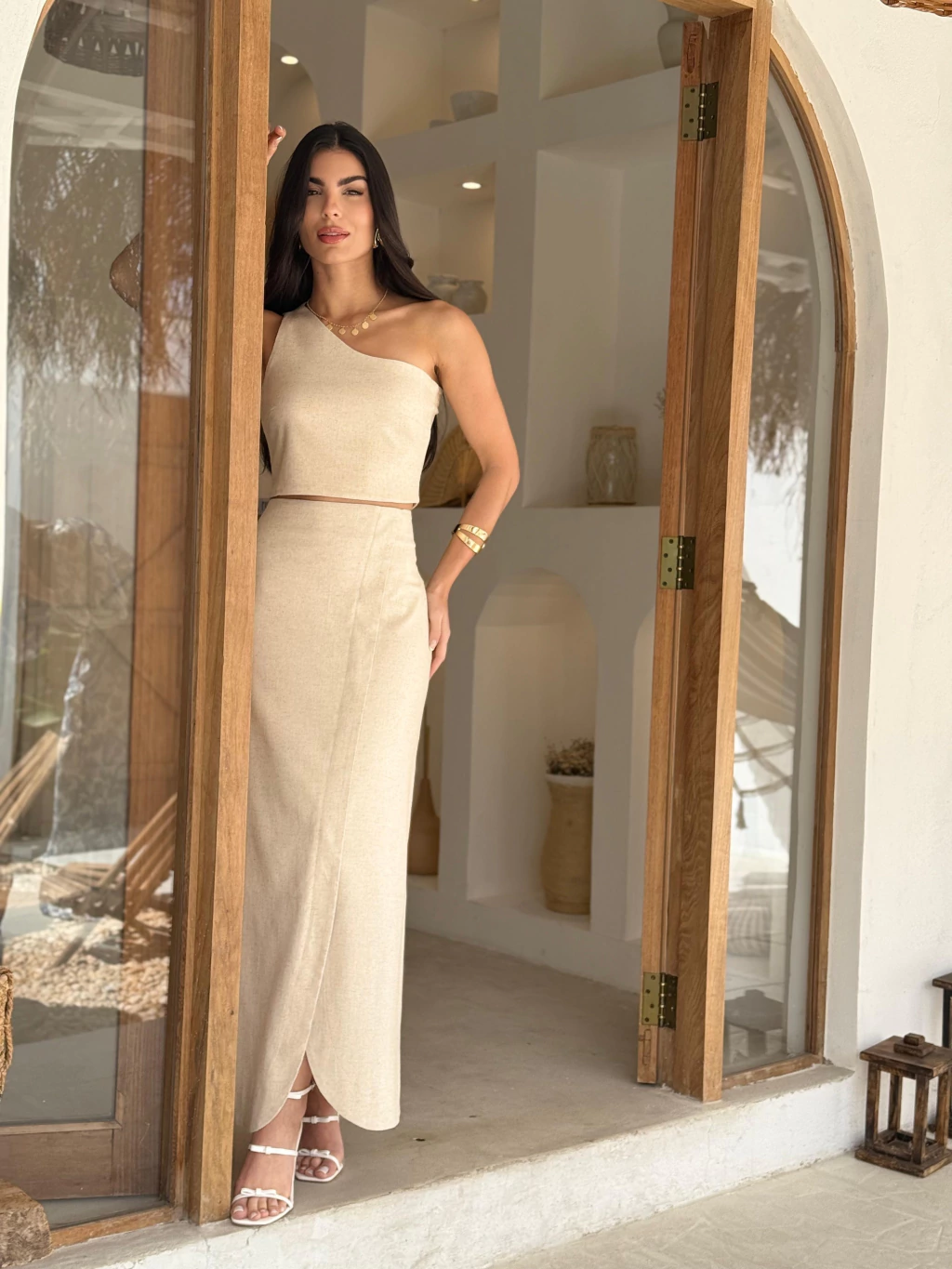Observação: Por se tratar de um tecido natural (linho ou viscose), a peça pode apresentar leve encolhimento no comprimento após a primeira lavagem.