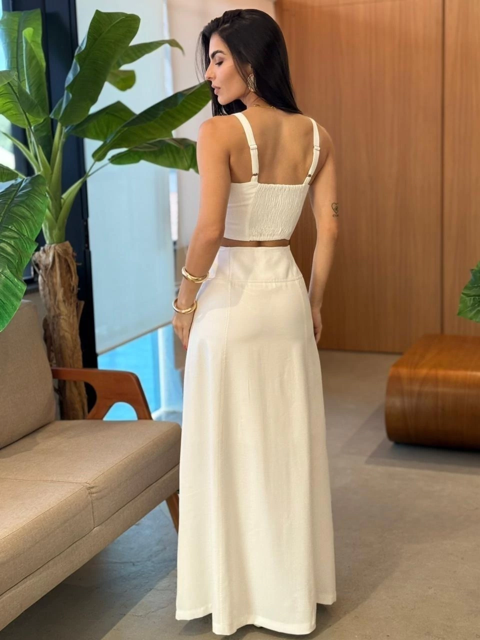 Observação: Por se tratar de um tecido natural (linho ou viscose), a peça pode apresentar leve encolhimento no comprimento após a primeira lavagem.