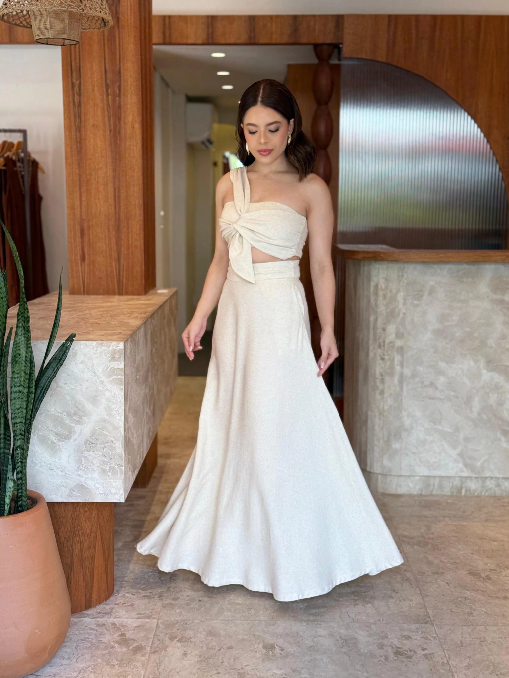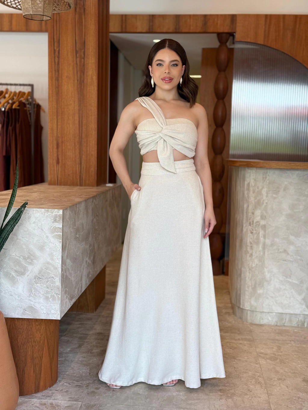 Observação: Por se tratar de um tecido natural (linho ou viscose), a peça pode apresentar leve encolhimento no comprimento após a primeira lavagem.