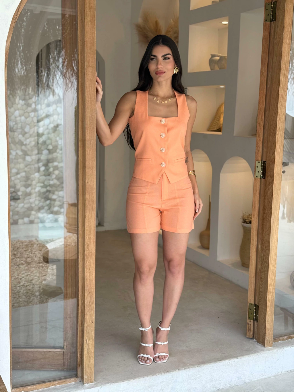 Observação: Por se tratar de um tecido natural (linho ou viscose), a peça pode apresentar leve encolhimento no comprimento após a primeira lavagem.