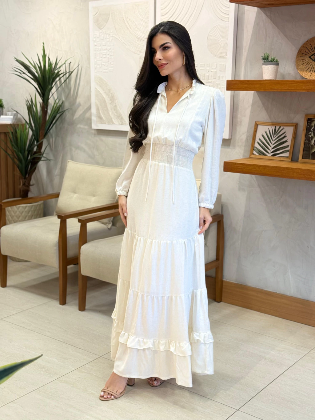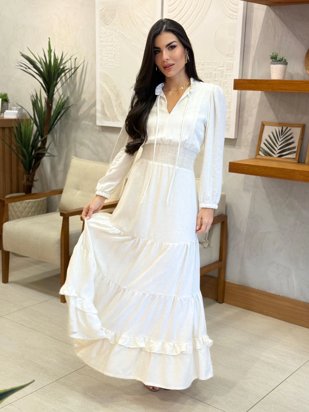 Observação: Por se tratar de um tecido natural (linho ou viscose), a peça pode apresentar leve encolhimento no comprimento após a primeira lavagem.