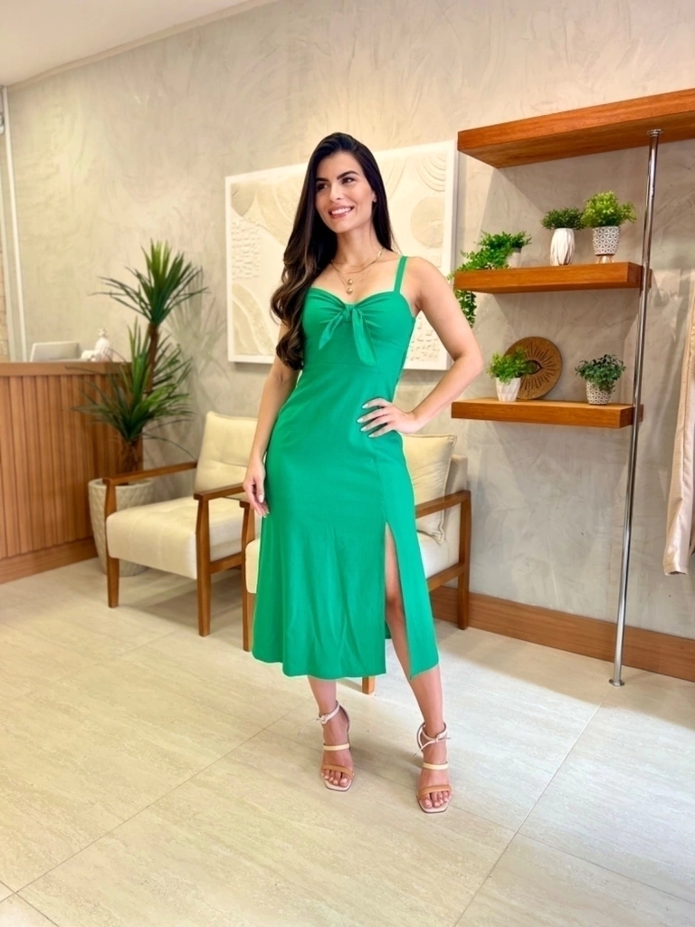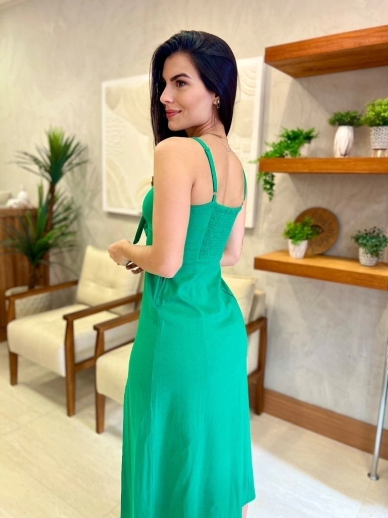 Este Vestido Midi em linho é uma peça sofisticada. Com fenda na saia, o modelo valoriza as pernas e confere um toque de sensualidade à peça. O corte midi é atemporal e elegante, sendo perfeito para diversas ocasiões, desde eventos formais até passeios no final de semana.